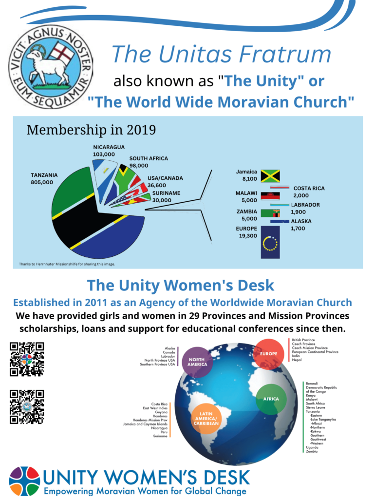 The Unity Women’s Desk was established by Unity Synod in 2011 and we are thus an official agency of the Unitas Fratrum, also known as the Worldwide Moravian Church or Moravian Unity.